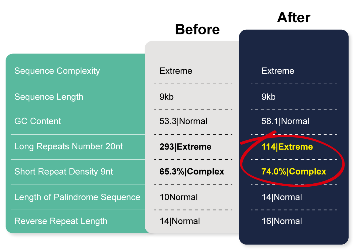 Optimized short repeat structures:The sequence was reorganized to effectively disperse short-repeat density and disrupt repeat continuity.
