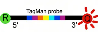 A typical TaqMan probe contains a reporter dye at the 5′ end and a quencher at the 3′ end.