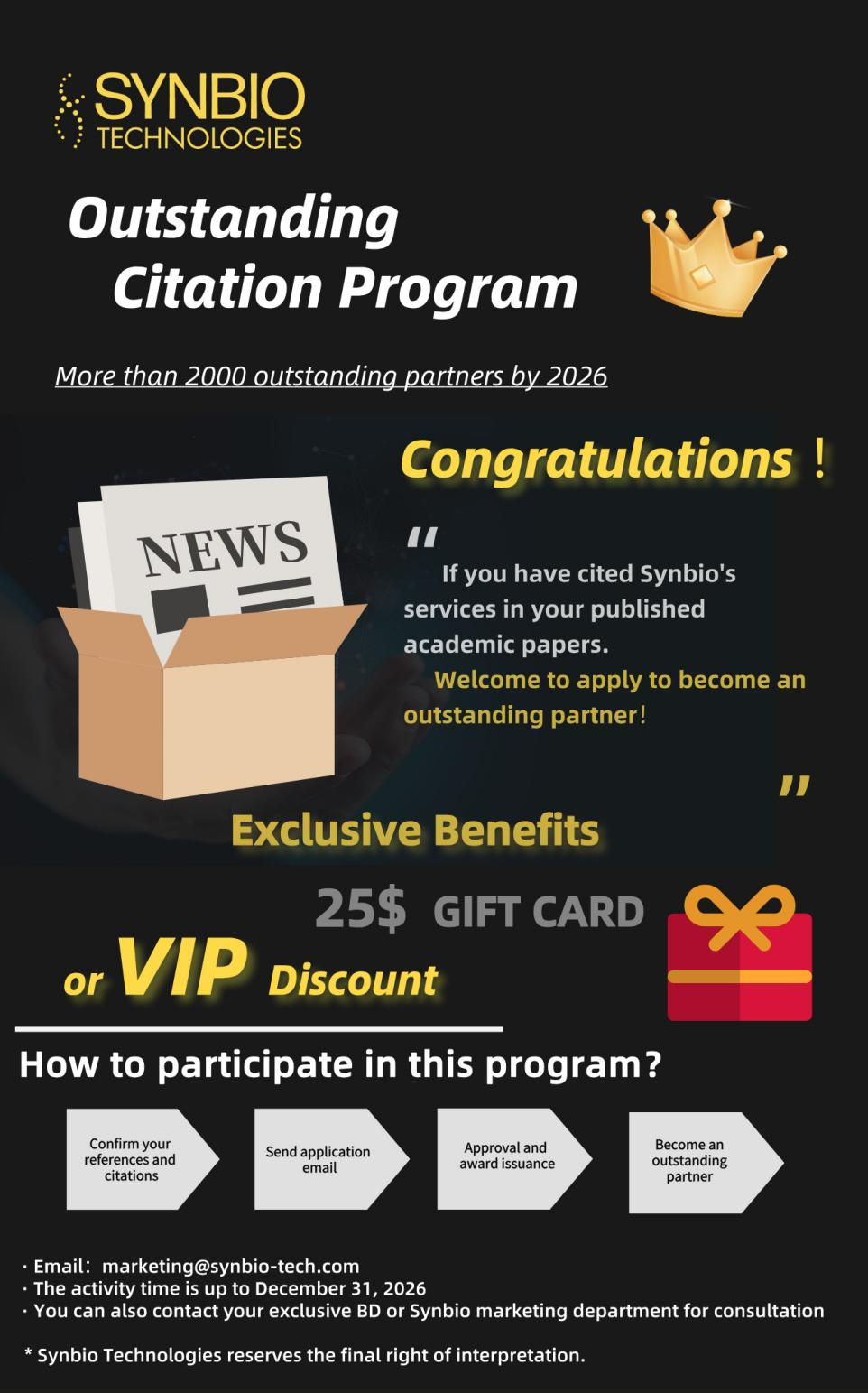 | Distinguished Citation Pioneer Award | High-impact publications including, but not limited to, Nature, Science, Cell series, and other SCI/SSCI indexed journals that explicitly cite Synbio Technologies. | $30 Discount Coupon | $25 Amazon Gift Card |